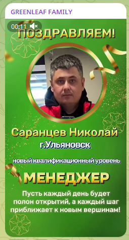 На канале, продвигающем развод в Telegram Greenleaf Family Official почти 26 тысяч подписчиков. Весь контент сводится к поздравлениям партнеров, которые перешли на новый уровень: