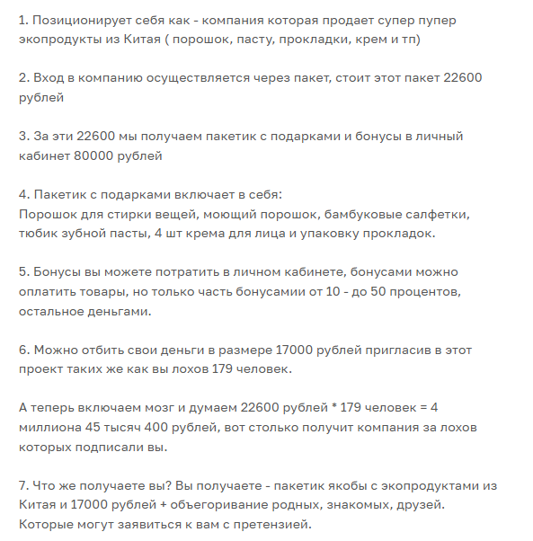 Хотя этот проект позиционируется как производитель товаров, фактически пользователей заманивают в МЛМ-структуру. Товары, которые предлагаются «партнерам» продаются хоть и со скидкой 50%, их стоимость все еще остается завышенной. Компании не так важны активные продажи, ведь она зарабатывает на своих «партнерах». Само собой, не обходится без всяких уровней в пирамиды, системы статусов: