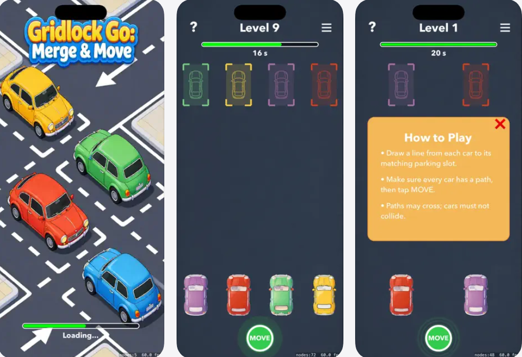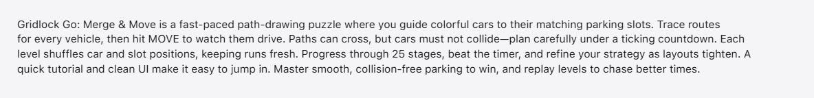 Игра GridLock Go доступна только в App Store. Приложение было опубликовано 11 декабря 2025 года. Она относится к категории головоломок, в которой нужно рисовать пути для автомобилей таким образом, чтобы каждая машина добралась до парковочного места соответствующего цвета.
