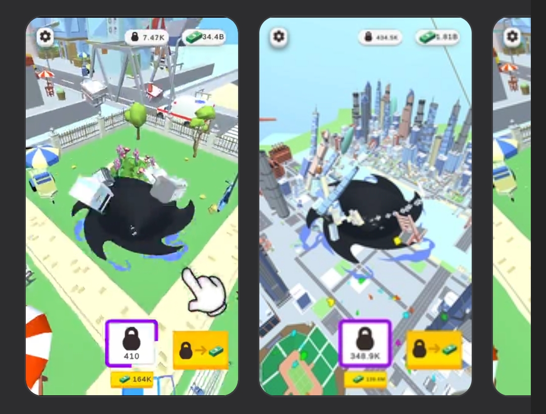 «Гроу Блэк Хол» – браузерная и мобильная игра-кликер, построенная на механике айдл. Суть проста: чёрная дыра увеличивается за счёт поглощения разных предметов, начиная от мелких частиц и заканчивая планетами. Основная задача в том, чтобы вырастить максимально большую дыру и открыть новые уровни космоса. Grow Your Black Hole не связан с инвестициями, несмотря на визуальное сходство игровой валюты с долларами.