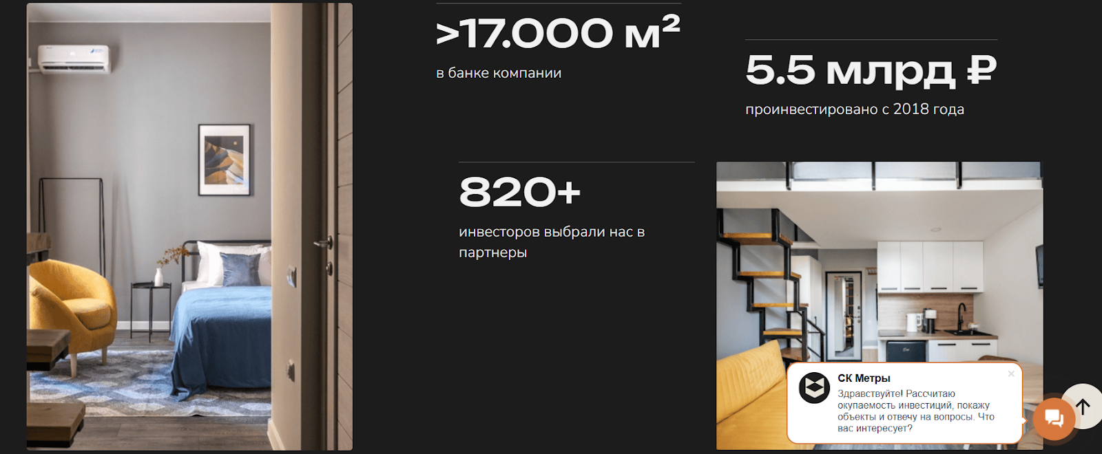 «Метры Групп» работают в сфере инвестиционного бизнеса с 2018 года. Компания строит двухуровневые квартиры-студии, якобы особенно популярные среди туристов и деловых людей. В банке организации якобы >17.000 м² при общем размере инвестиций в ₽5,500,000,000.
