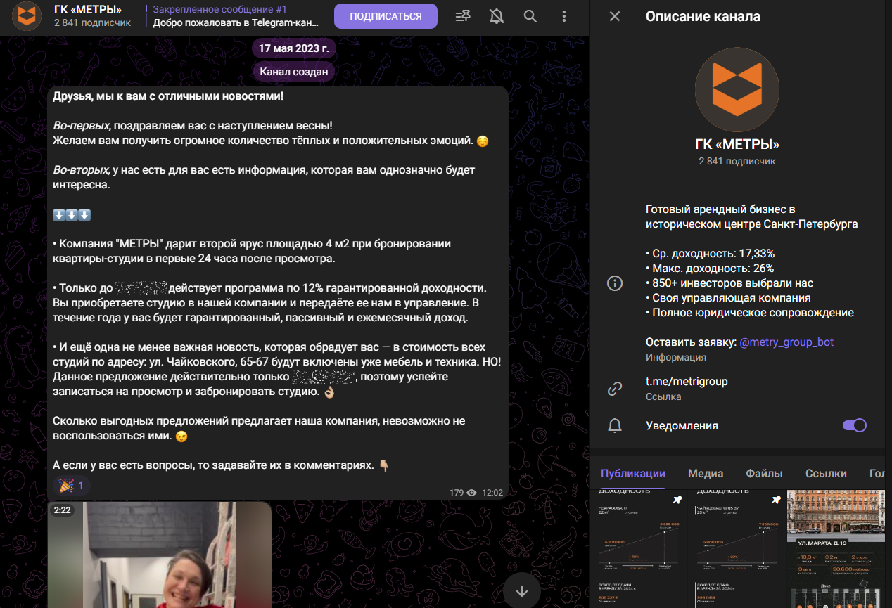 MetriGroup есть в Телеграмм. Канал был зарегистрирован 17 мая 2023 года. В приветственном посте компания поздравляет пользователей с наступлением весны и знакомит с последними новостями «Метры»: