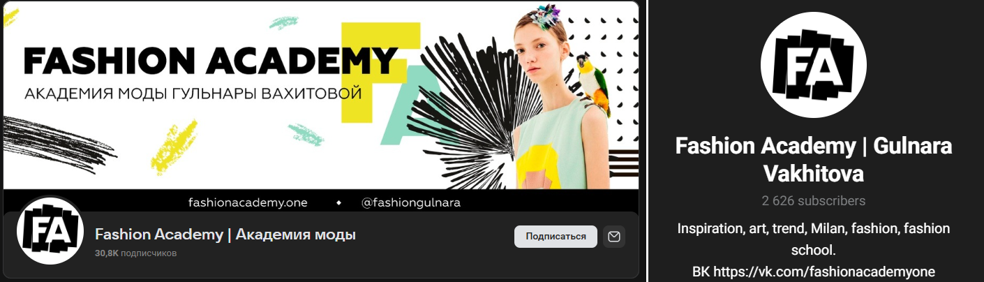 Дизайнер ведет группу @fashionacademyone во «ВКонтакте», на которую подписано более 30 000 человек, но, судя по активности, тут могла применяться накрутка. На телеграмм-канал @fashionacademymilan подписано менее 3 000 пользователей, показатели слишком разные – эти цифры кажутся более реальными.