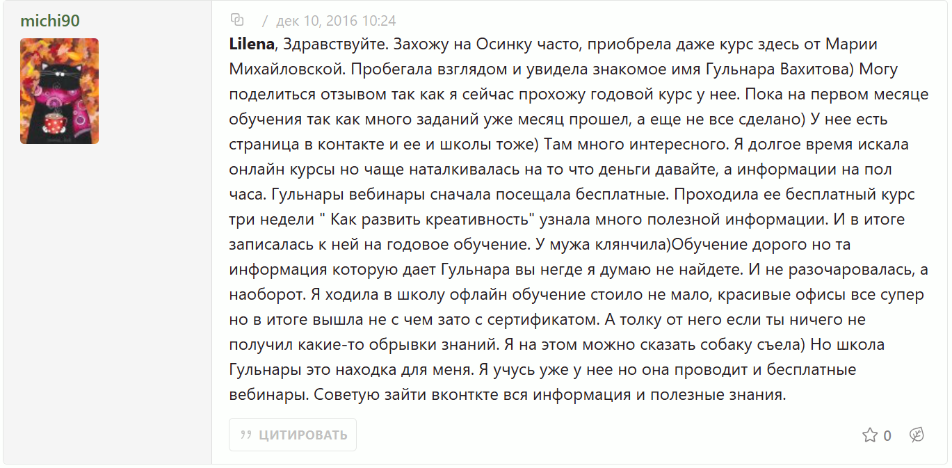 Отзывы о курсе «Конструктирование» Гульнары Вахитовой есть в «Телеграмме» и на форуме, где студенты дизайнера в положительном ключе делятся впечатлениями. Утверждается, что автор грамотно подает материал и умеет работать с аудиторией, а многие полезные материалы есть в свободном доступе в социальных сетях.