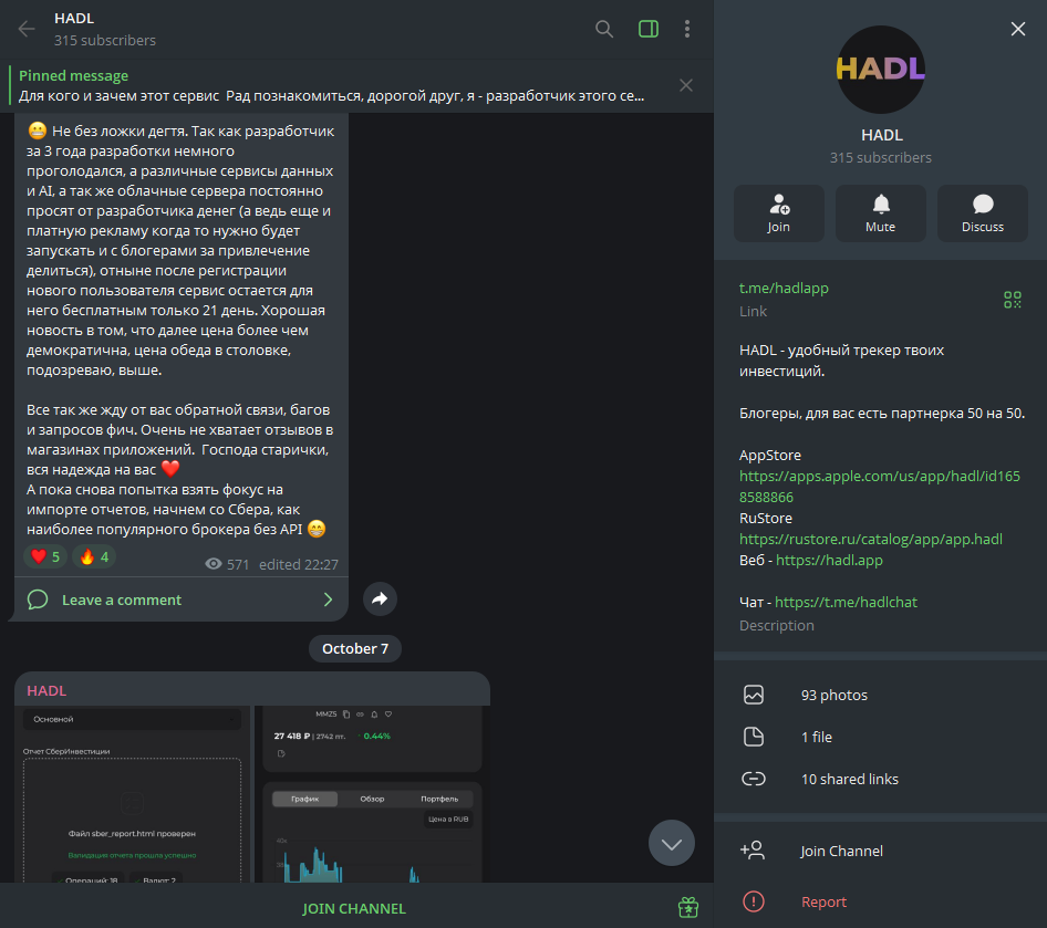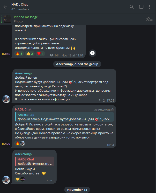 Для связи с поддержкой предлагается электронный адрес, но отдельно стоит отметить ТГ-канал hadlapp на 315 подписчиков и публичную группу hadlchat в том же мессенджере на почти 50 участников.