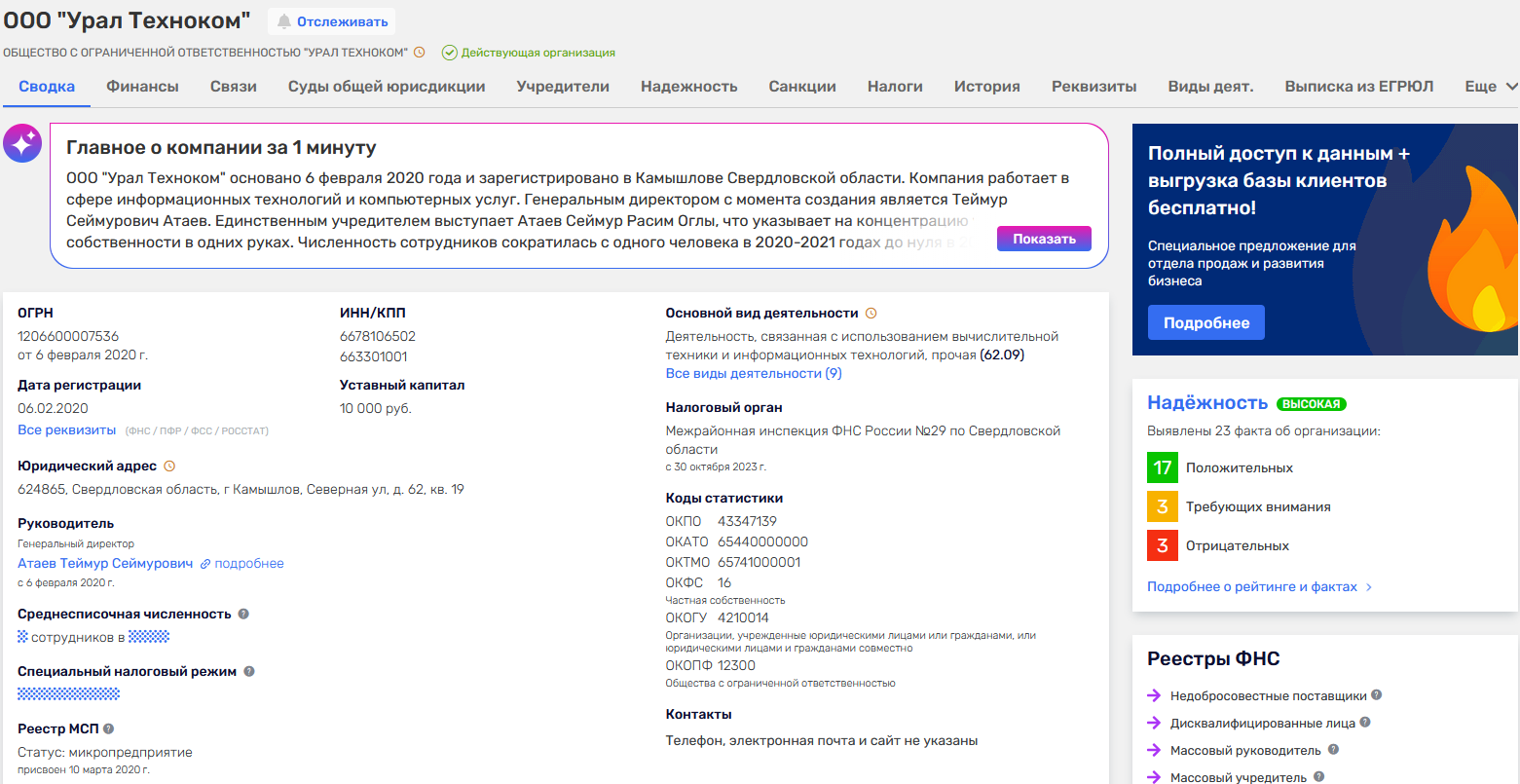 Что касается юридической стороны, на сайте опубликованы реквизиты ООО «Урал Техноком», они же дублируются и в подробных политиках конфиденциальности и сервиса в целом. Это реальная компания, зарегистрированная с 2020 года в Свердловской области. Агрегатор Rusprofile оценил ее высоким индексом надежности.