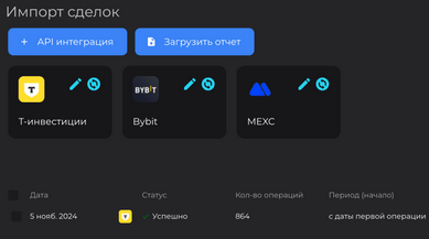 - импорт сделок через API и отчеты;