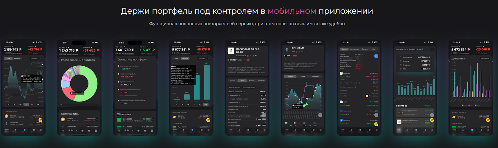 Поддерживает система акции, криптовалюты, облигации, фьючерсы, ETF, депозиты и даже недвижимость. А основными функциями ее разработчики называют следующие: