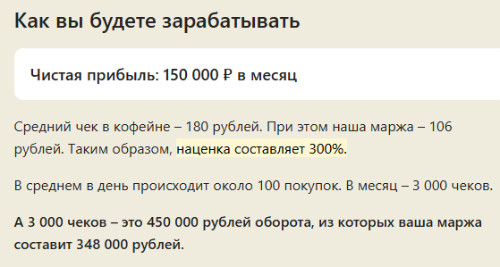 Аферисты рисуют «красивые картинки» потенциального заработка франчайзи, гарантируя чистую прибыль 150 тыс. руб. в месяц. Они даже не упоминают о таких рисках, как низкий спрос на кофе, рост цен на сырье, конкуренцию. Но эти факторы способны «уронить» финансовые результаты до нуля и даже привести к убыткам.