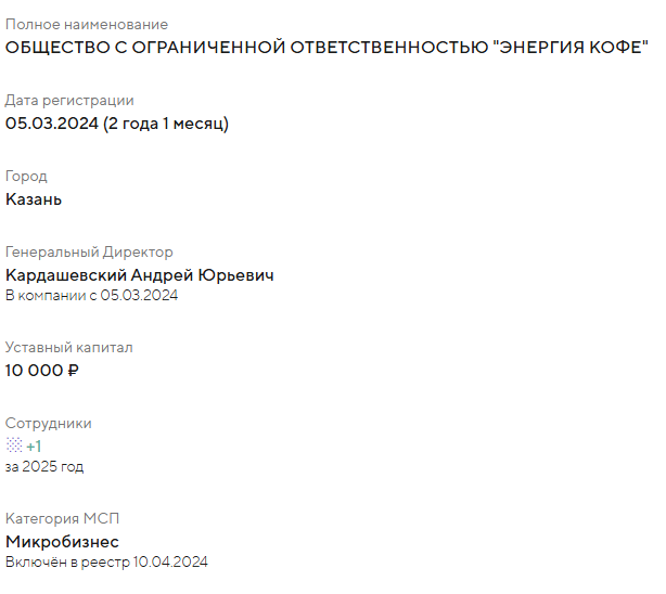ООО «Энергия Кофе» создано совсем недавно — в 2024 году, его уставный капитал составляет 10 тыс. руб. Мы видим типичные признаки фирмы-однодневки.