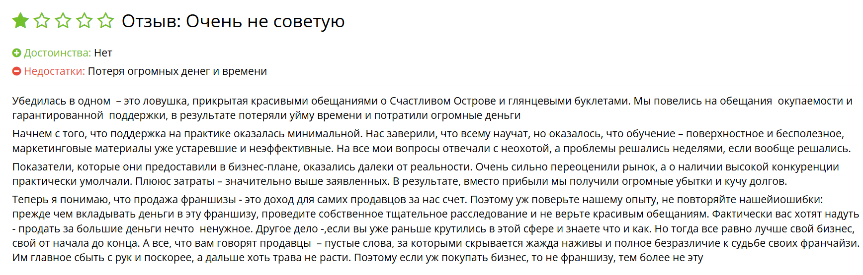 Один из клиентов в своем отзыве о франшизе «Хэппи Айленд» пишет, что не советует связываться с этим проектом. Скамеры предоставляют поверхностное обучение, переоценивают рынок и молчат о конкурентах. В итоге франчайзи получают большие убытки вместо обещанной прибыли.