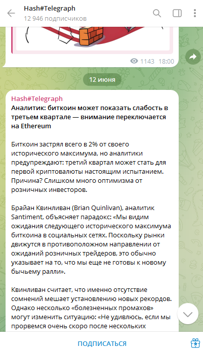 Hash Telegraph — это телеграмм-канал, автор которого публикует новости и другую полезную информацию о криптовалютах, блокчейне и цифровых технологиях. Канал позиционируется как источник трендовых материалов, где публикуется только проверенная информация. Так ли это – давайте разберемся.