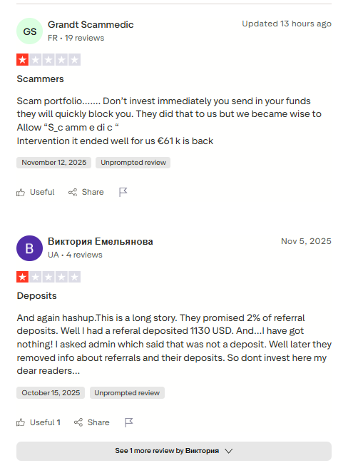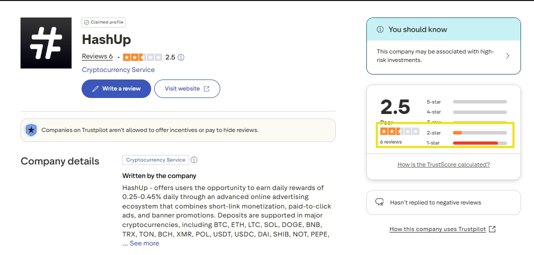 В сети положительных отзывов о https hashup cc не найти, один негатив. Как и любой хайп, платформа не предполагает большого дохода. Условия работы стали менять каждую неделю, вероятно, скам проекта уже близок. Появились жалобы на сложности с выводом, для снятия ввели верификацию, которую сложно пройти — контора отклоняет предоставленные документы. Контору называют скамом, рейтинг на Трастпилоте равен 2,5. Огромное количество жалоб на вложения в хешрейт, которые не только не окупились, но и сгорели в последних обновлениях сервиса.