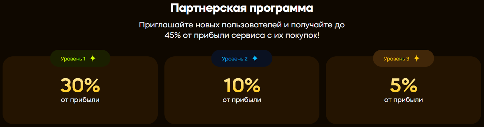 Покупать предлагаемые товары можно за криптовалюту, с банковских карт или при помощи СБП. Дополнительно есть партнерская программа, по которой можно получать до 30% от прибыли сервиса с привлеченного клиента.
