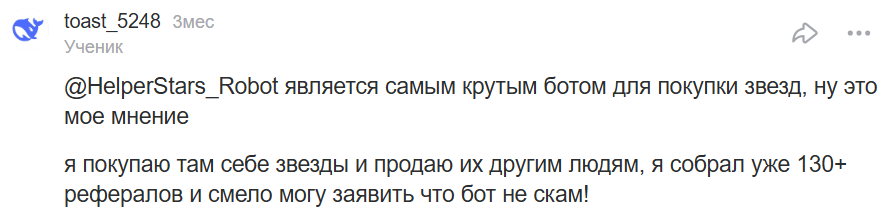 В интернете есть несколько отзывов о Helper Stars и боте Helperstars robot, все они положительные. Некоторые пользователи называют платформу лучшим местом для покупки звезд.