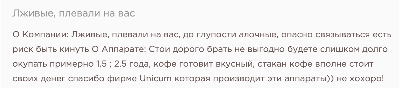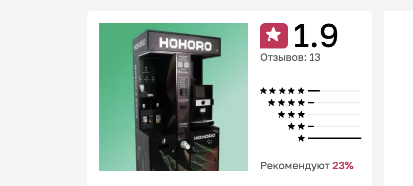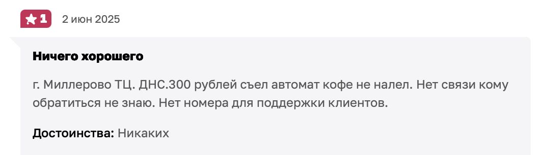 Недовольство высказывают не только о франшизе, но и самом продукте. Потребители жалуются, что автоматы часто «съедают» купюры или карты и не выдают кофе, а связаться с поддержкой практически невозможно — на самом аппарате нет телефона, а горячая линия либо не отвечает, либо переводит стрелки.