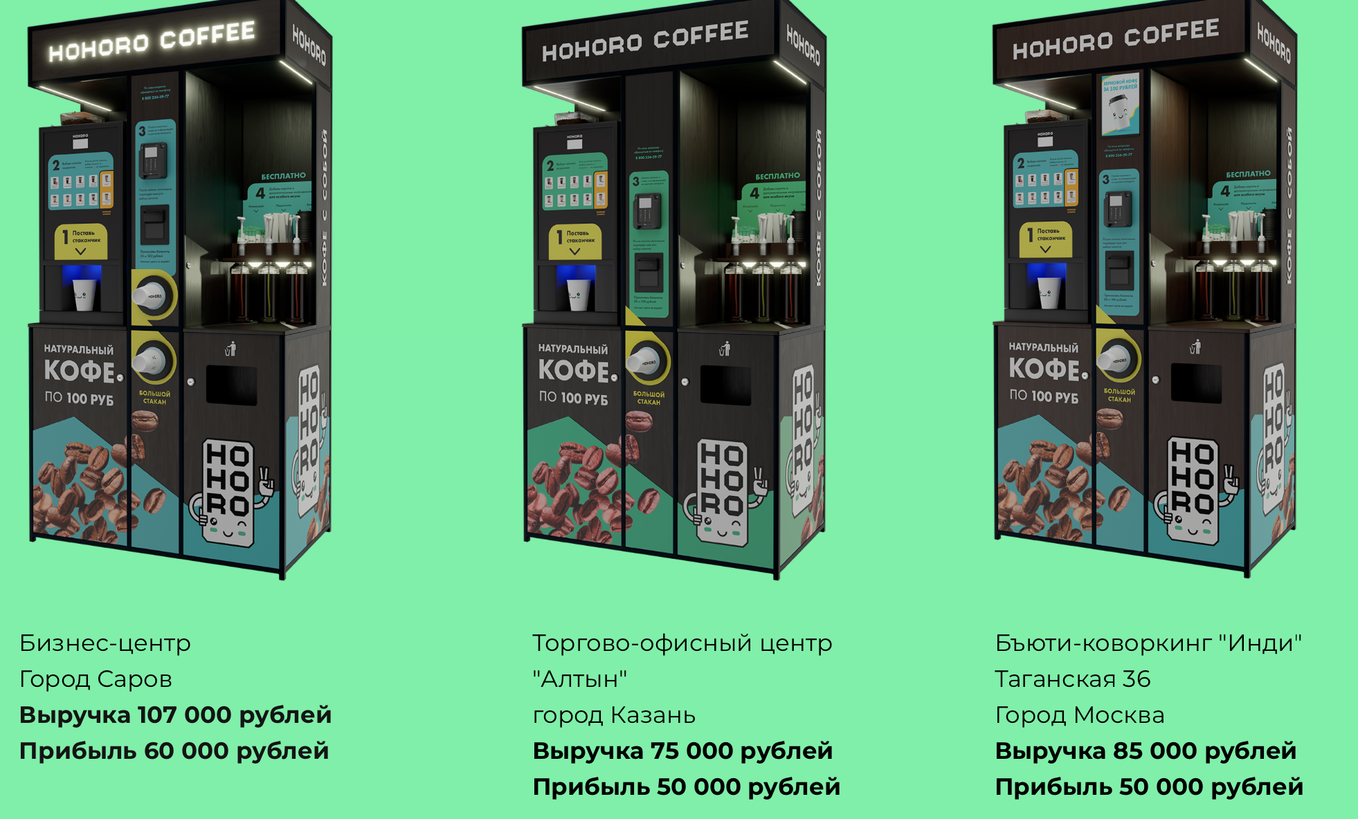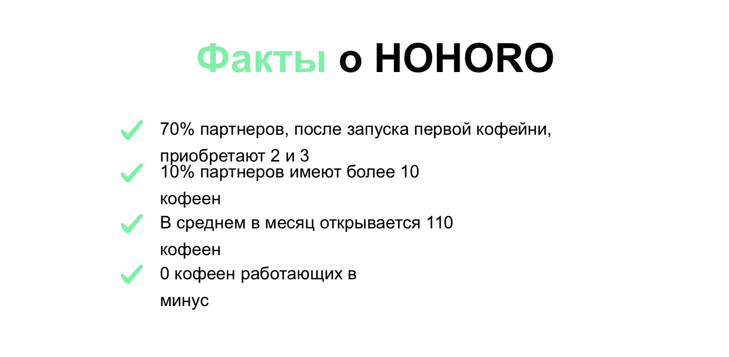На сайте и в презентациях нас убеждают, что Hohoro Coffee — франшиза с окупаемостью до года при выручке от 40 до 100 тысяч чистой прибыли в месяц с одной точки. Потенциальным партнерам показывают красивые отчеты, данные в которых явно приукрашены. По словам самих авторов проекта, 70% франчайзи открывают еще несколько спотов, а в среднем по сети запускается более 100 новых кофеен в месяц.