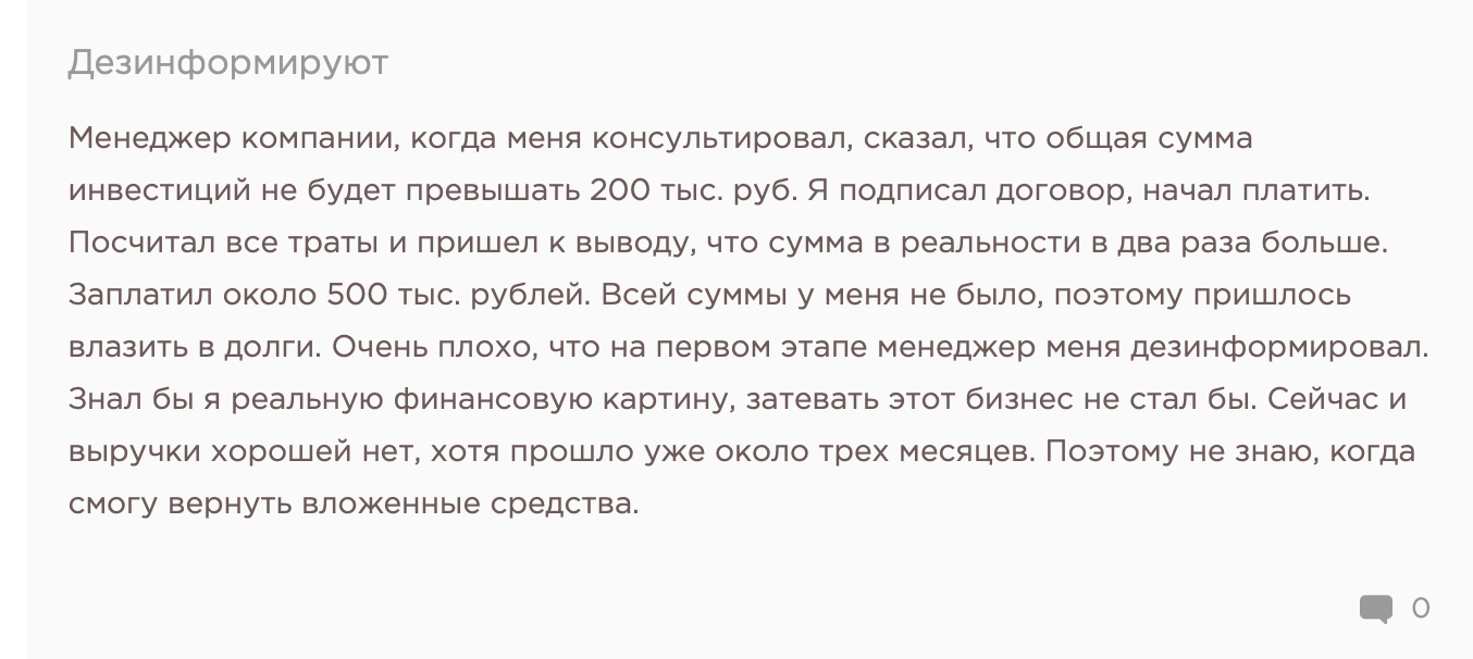 Дополнительным риском служит очень высокая конкуренция в нише: в крупных городах точки стоят чуть ли не на каждом углу, и реальная проходимость ниже заявленной. Компания делит риски «пополам» только на словах — на практике возврат инвестиций возможен максимум 60–70% и то после долгой переписки.