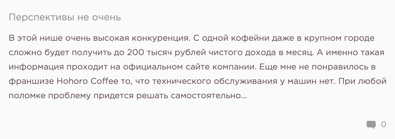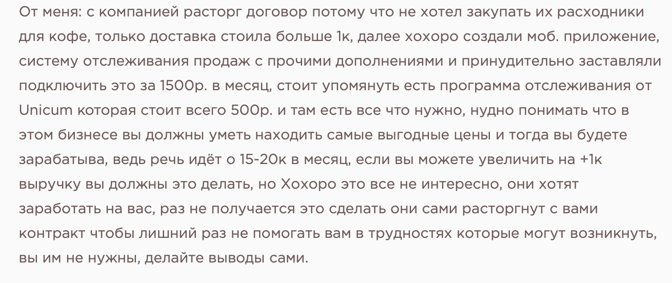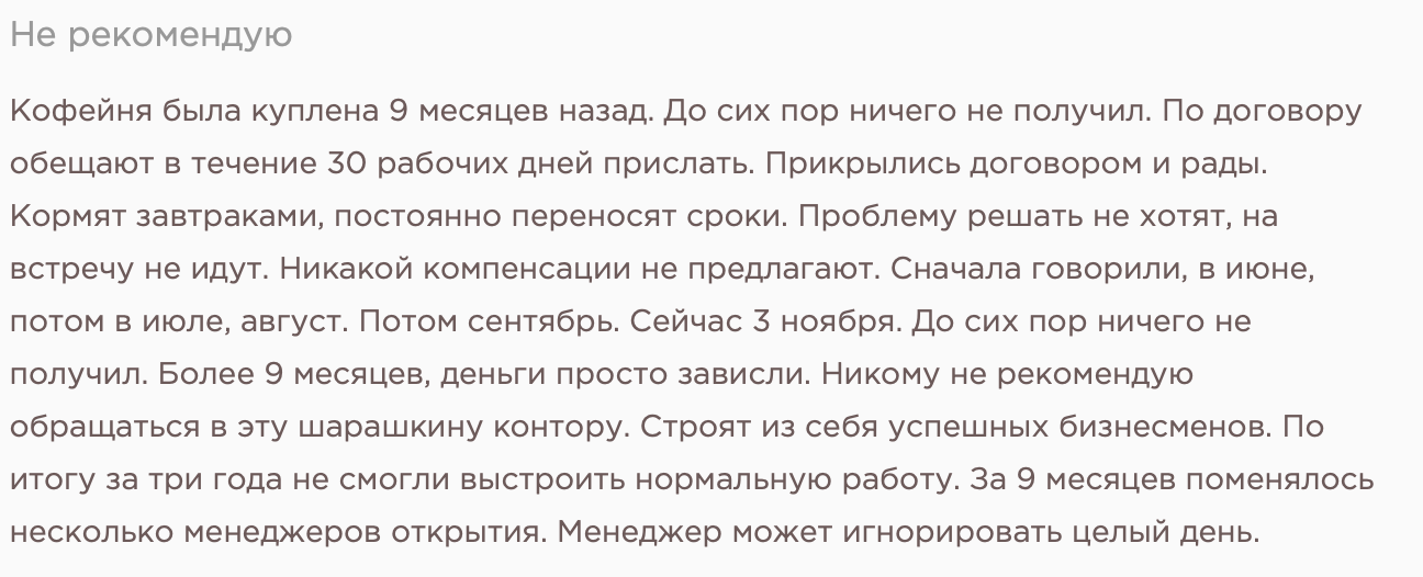 Реальных отрицательных историй в открытом доступе довольно много. Поступают они как от партнеров-франчайзи, так и от обычных покупателей. На франшизу Hohoro Coffee отзывы говорят про низкую доходность бизнеса. Франчайзи пишут о долгом ожидании оборудования (до 7–9 месяцев), грубом отношении менеджеров, отсутствии реальной помощи с локацией и маркетингом.