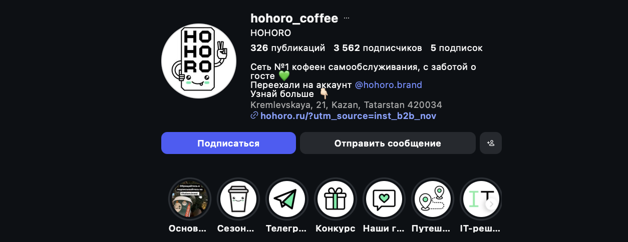 В Instagram проект также продвигается через аккаунт @hohoro_coffee. Аудитория здесь совсем небольшая — около 3500 подписчиков. Контент преимущественно рекламный: кейсы партнеров, красивые стаканчики и призывы «открыть свою точку».