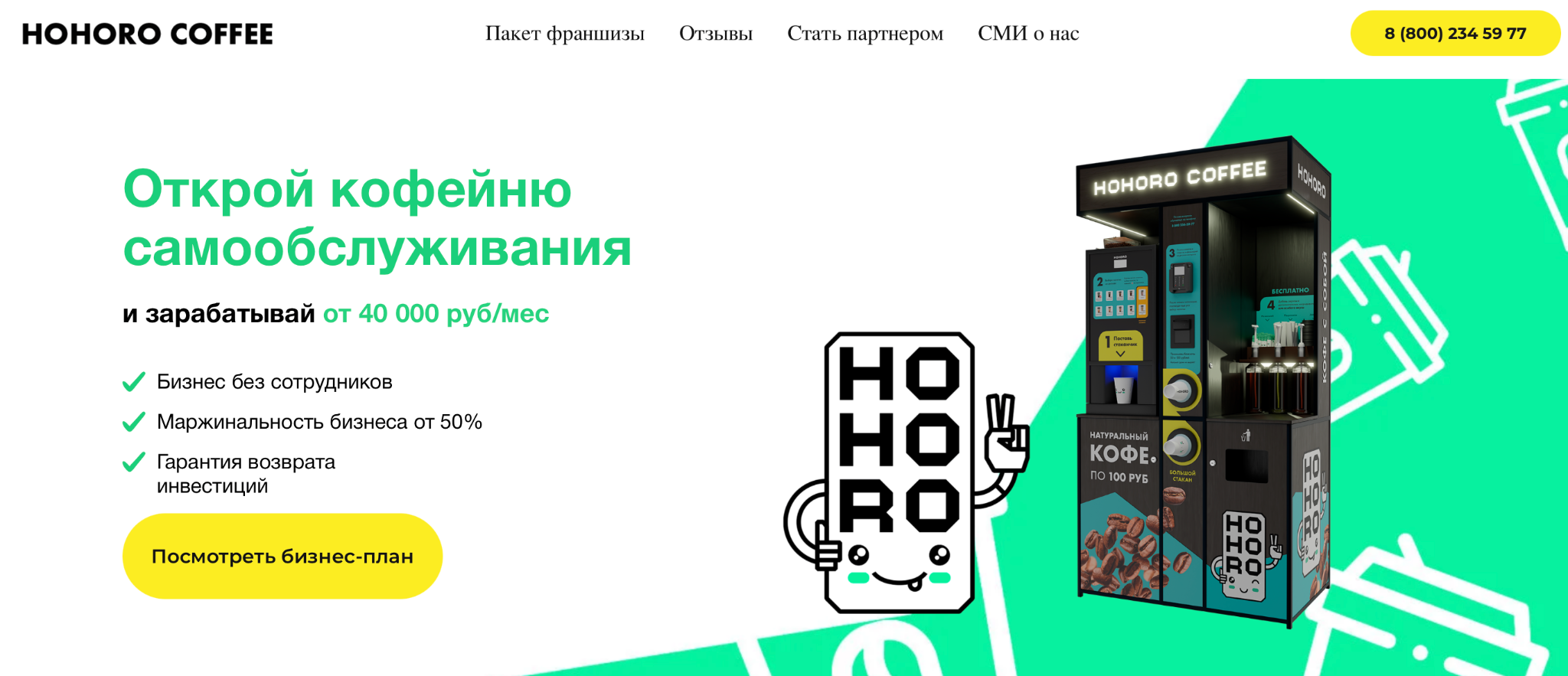 «Hororo Coffee — франшиза, продвигаемая через простенький продающий сайт hohoro.ru. На его страницах мы видим большие фото кофейных автоматов, карты присутствия, разделы с отзывами и горячей линией.
