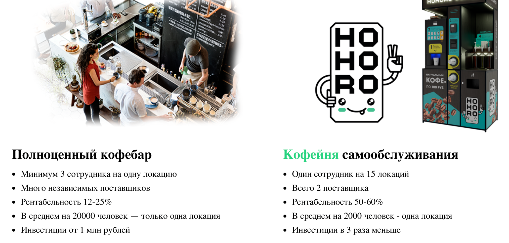 Hohoro Coffee — франшиза, агитирующая продавать кофейные напитки через автоматизированные споты по типу вендинговых аппаратов, но с более качественным кофе. Компания активно продвигает идею быстрого и выгодного бизнеса, обещая гарантированную окупаемость.