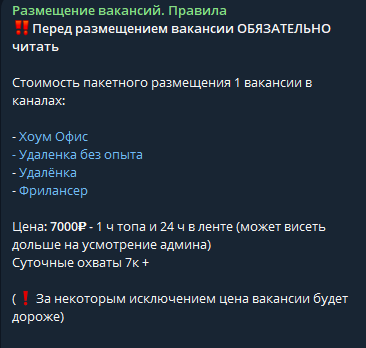 Админ «Хоум • Удаленная Работа» продает размещение вакансий в пакете каналов за ₽7,000 с охватом 7 000 просмотров в сутки. В правилах размещения написано, что канал не принимает скам, помощников трейдера и криптовалютные проекты.