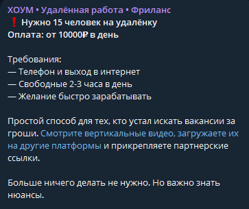 Отдельно стоит отметить посты на канале «Хоум • Удаленная Работа» с явными признаками обмана: доход ₽10,000 в день за «просмотр видео и загрузку на другие платформы», работа в «команде связанной с трейдингом» с доходом от ₽40,000 в неделю без опыта.