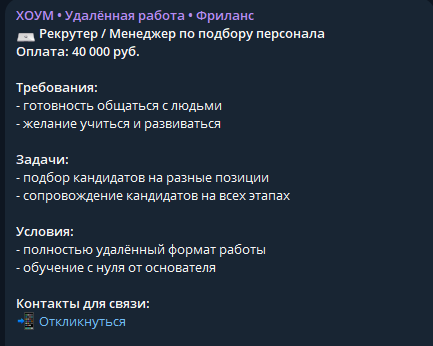 Нормальные вакансии на канале «Хоум • Удаленная Работа» тоже встречаются, но отличить их от мошеннических без комментариев и отзывов крайне сложно. Безопаснее искать работу на проверенных площадках.
