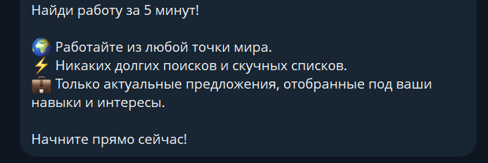 Мы не рекомендуем пользоваться данным ботом для поиска работы. Тут применяется распространенная среди мошенников схема с предложением должностей, связанных со скамом. От работников потребуются вложения на специальную платформу, с которой нельзя будет вывести средства.
