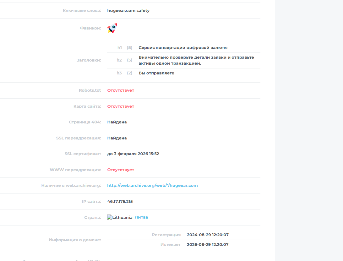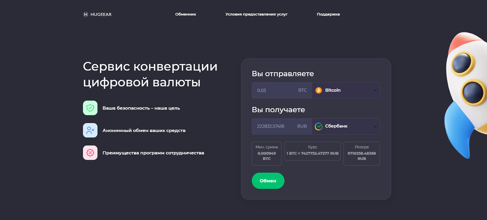 Аферисты принимают любую валюту (доллары, рубли, евро), работают с криптовалютами на разных блокчейнах. Проверим факт регистрации, гарантии, которые предоставляет Hugeear обменник своим клиентам, проведем технический анализ сайта сервиса.