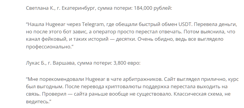 Про hugeear com обменник отзывы пользователям писать просто негде, так как скам каналы арбитража крипты недовольных клиентов блокируют, а обращения в правоохранительные органы не дают никаких результатов.