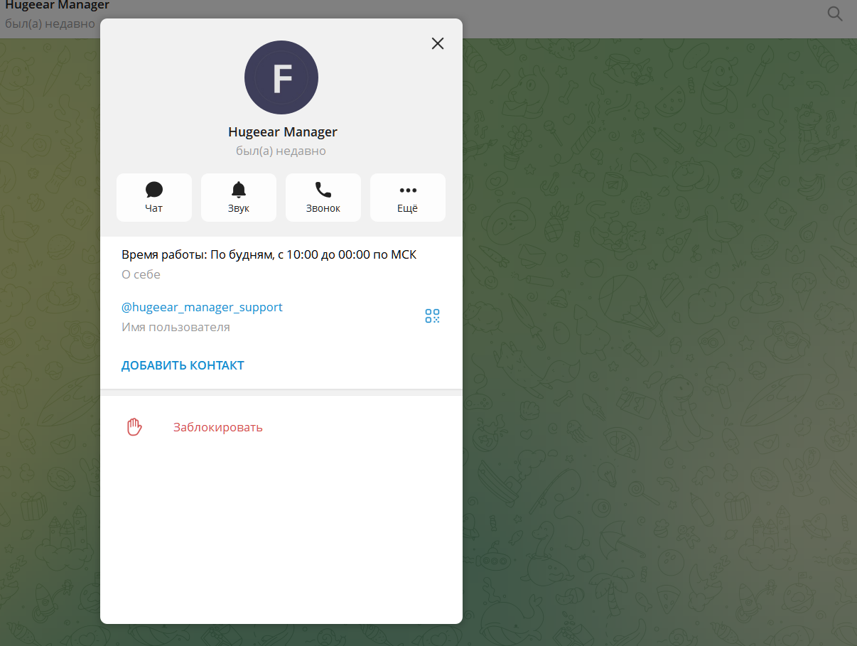 Для связи с администрацией платформы предусмотрен только ТГ канал hugeear manager support. Нет адреса электронной почты, телефона, онлайн чата техподдержки. Менеджер работает с понедельника по пятницу с 10 до полуночи, суббота и воскресенье выходной.