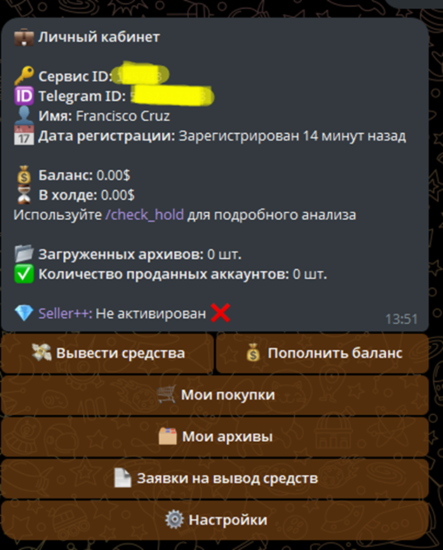 В личном кабинете находится информация об ID и имени клиента, балансе, купленных или проданных аккаунтах. Тут же можно увидеть текущий статус (активируется после первой операции), перечень всех архивов. Пополнить счет или вывести средства можно через кабинет, тут же доступен раздел для отслеживания текущих заявок.