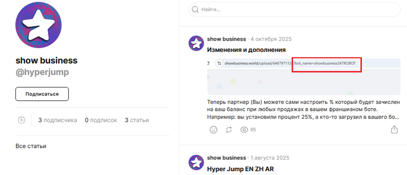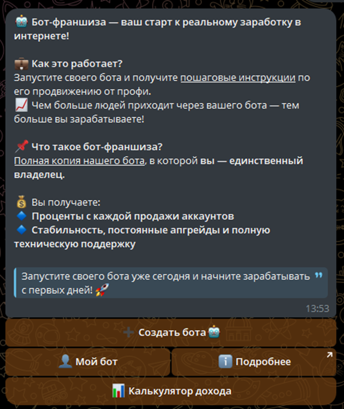 Дополнительно клиентам обещают пассивный доход на франшизе. Для этого нужно создать отдельный бот, получив полную техподдержку от Гипер Джамп. Заработок составит 3% комиссионных от всех операций. Пользователю будут предоставлены инструкции, в том числе, по продвижению в мессенджере. Обещают все актуальные апгрейды и стабильные выплаты, расширение функционала.