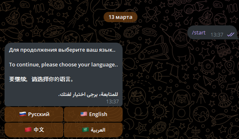 При открытии бота в Телеграмм предлагается выбрать язык общения. Официальными вариантами являются русский и китайский. Английский и арабский доступны только через автоперевод.