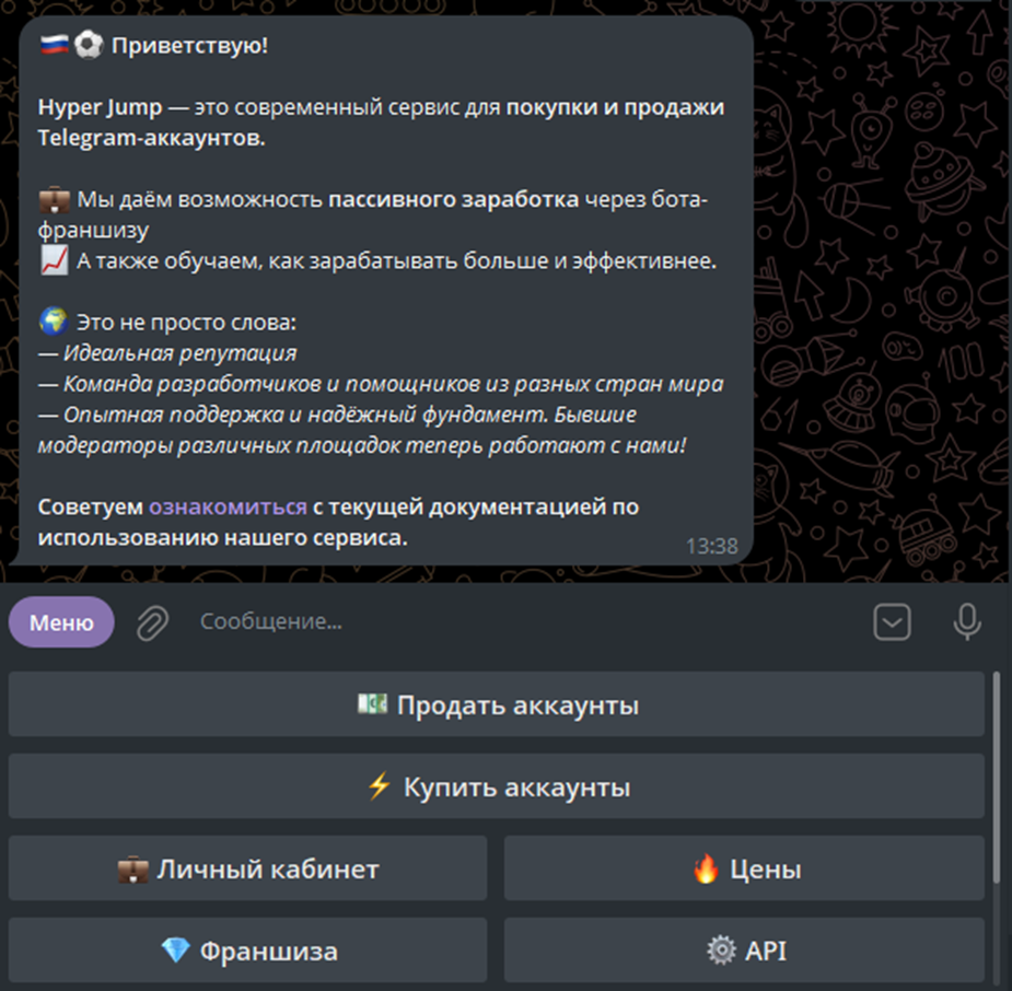Hyper Jump – проект, легальность работы которого вызывает сомнения. Он уже успел сменить название, специализируется на перепродаже аккаунтов в Телеграмм. Среди выявленных минусов: