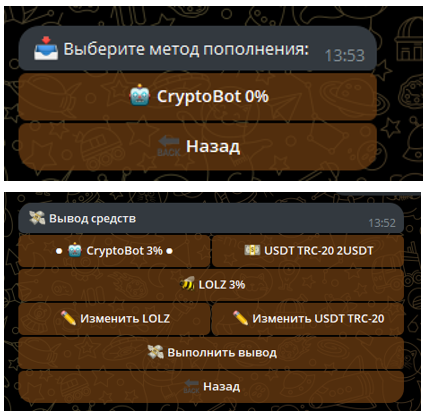 Пополнение счет осуществляется через CryptoBot (лимит – от 1 у.е.). Комиссия нулевая, сроки зачисления не указаны. Для вывода можно воспользоваться тремя способами: