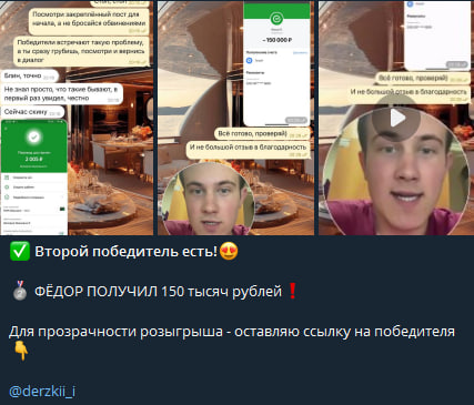 В телеграм-канале I Valentina Frinbridge девушка выкладывает отзывы пользователей в качестве скриншотов переписок и коротких роликов от победителей. Также она указывает аккаунты этих пользователей. Но каждый из них имеет статус «был в сети в этом месяце» и совсем не оформленный аккаунт. Все отзывы положительные. Девушка не стала бы портить себе репутацию. Если вообще эти отзывы являются настоящими, а не фальшивыми. А их легко подделать.
