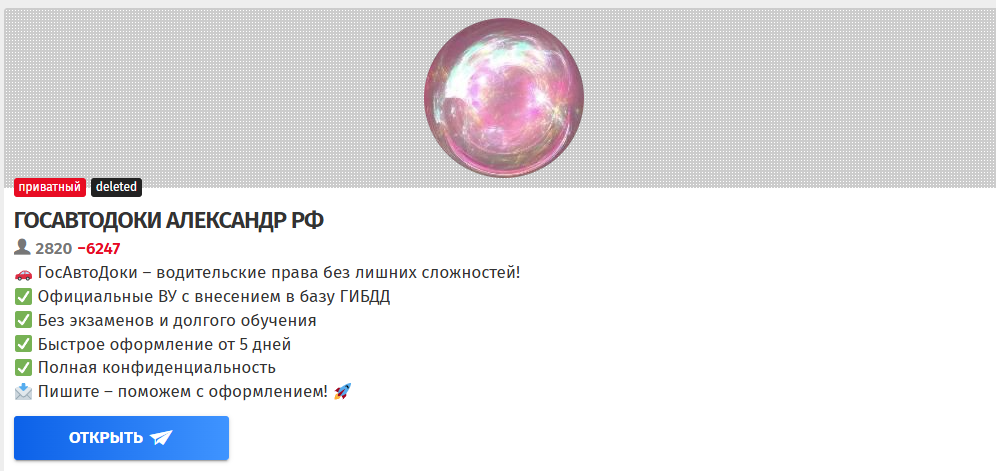 На канале пользователям предлагалась помощь в оформлении, восстановлении ВУ, получении других необходимых для водителей документов. При этом заметим, что подобного рода предложения просто не могут быть законными. Покупка документов – подсудное дело, несмотря на заявления анонимных авторов об официальной работе.