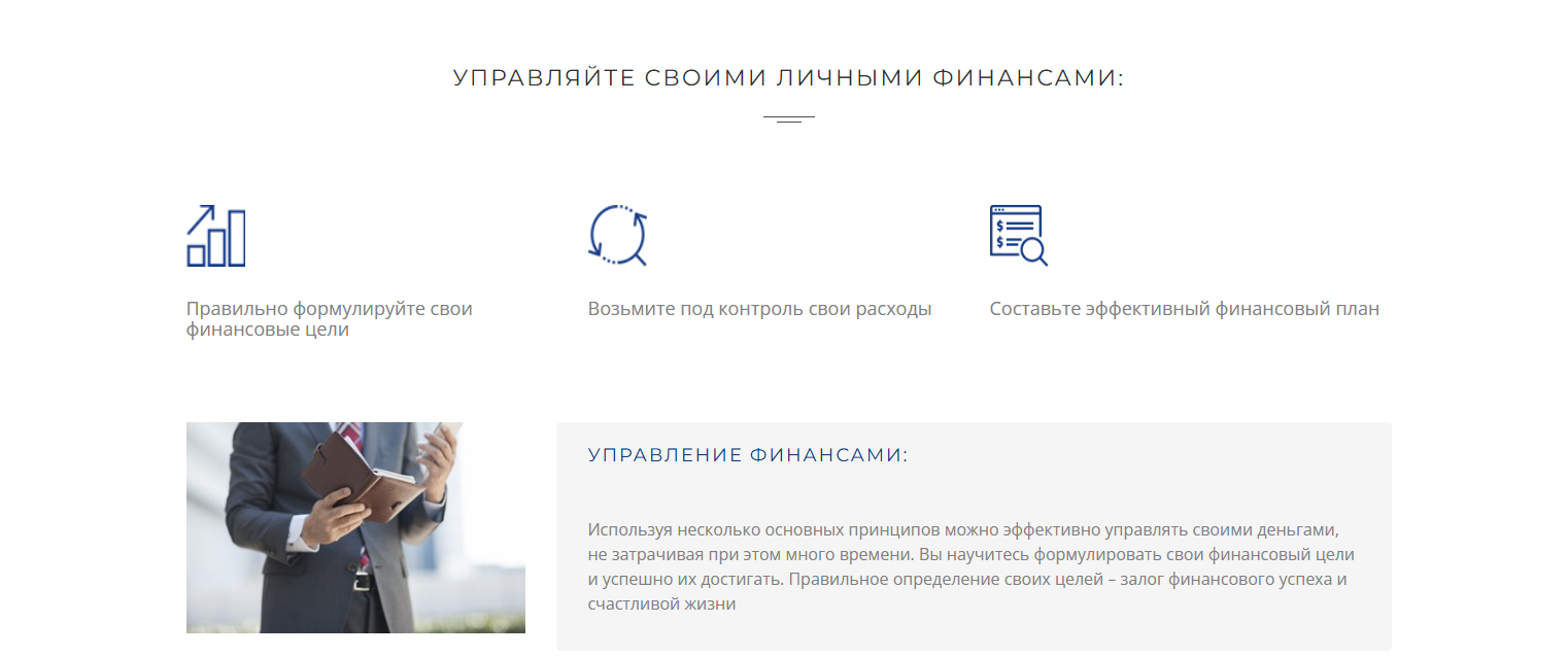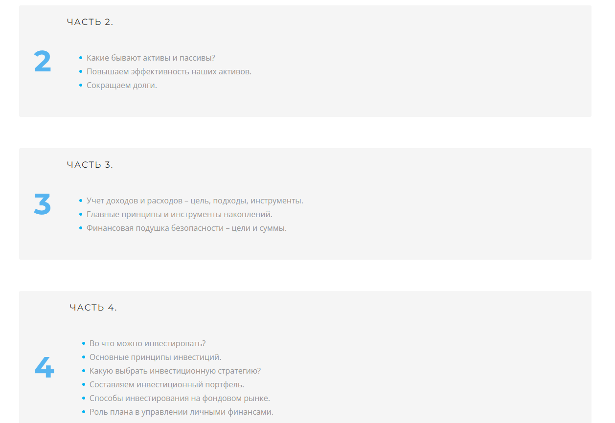 - 4 часть: крупный информационный блок с источниками инвестирования, стратегиями и планами для управления финансами.
