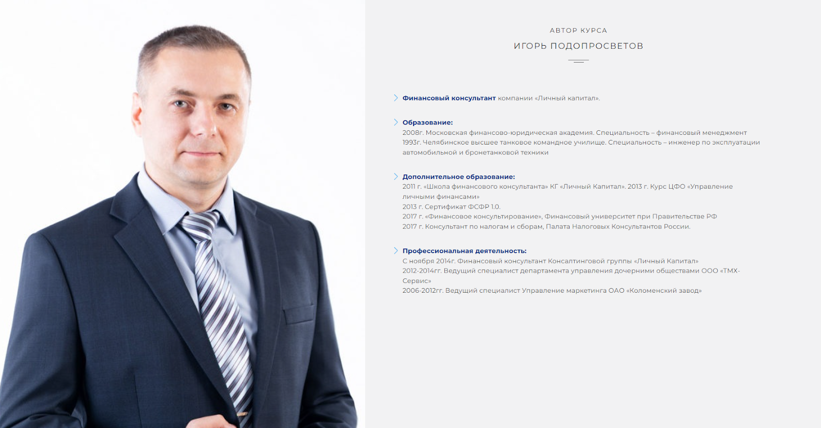 Игорь Подопросветов — это российский трейдер, который якобы занимается инвестициями с 2006 года. Известен Игорь не только благодаря своим курсам, но и за счет сотрудничества с консалтинговой группой “Личный Капитал”. При этом его направление не совсем связано с активной торговлей, он больше похож на финансового консультанта, который поможет управлять своими сбережениями. Но можно ли ему доверять, узнаете в данной статье.