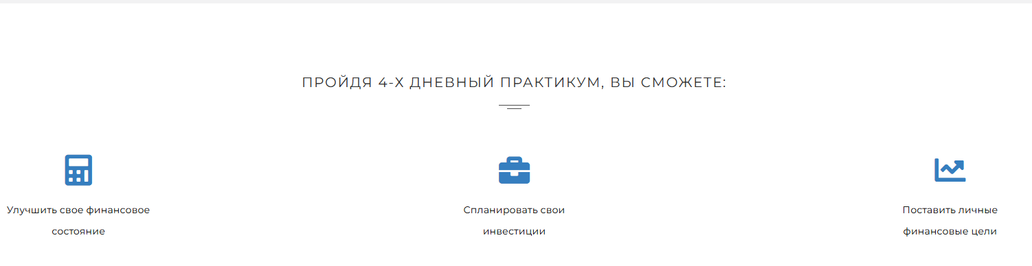 Такие обещания ничем не подтверждены, гарантий на заработок нет. Что касается теоретического блока, то основные вопросы, которые будут разбираться на практикуме, это: зачем и как управлять финансами, а также с чего начать и куда инвестировать свои деньги. Есть небольшой промо ролик, там нет полезных советов, только маркетинговые уловки и продвижение собственного курса.