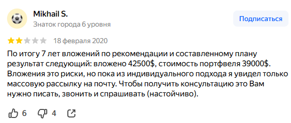 Также есть несколько нейтральных комментариев, где люди рассказывают о потере некоторого процента от депозита. Например, некий Михаил инвестировал под управление компанией $42 500, но через 7 лет получил назад лишь $39 000. Вдобавок они жалуются на постоянную спам рассылку и настойчивое продвижение платных консультаций.