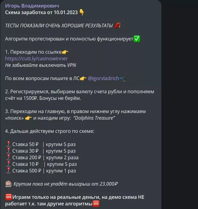 «Игорь Владимирович» обещает гарантированные выигрыши в казино, но на деле это просто развод для доверчивых. ([ ](