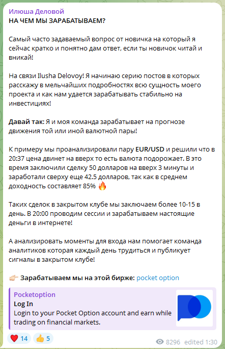 Илюша Деловой – Телеграм-канал, который ведет пользователь ilushadelo, представляющийся опытным трейдером. Мы вынуждены сразу сделать оговорку, что фактически его деятельность нельзя назвать трейдерской. Это обычная лудомания со ставками на бинарных опционах. Обычно подобные проекты заводятся для того, чтобы убеждать пользователей зарегистрироваться на сайте брокера бинарных опционов и зарабатывать на слитых депозитах. В ходе обзора рассмотрим подробнее работу автора, чтобы понять, стоит ли тратить на него время и деньги.
