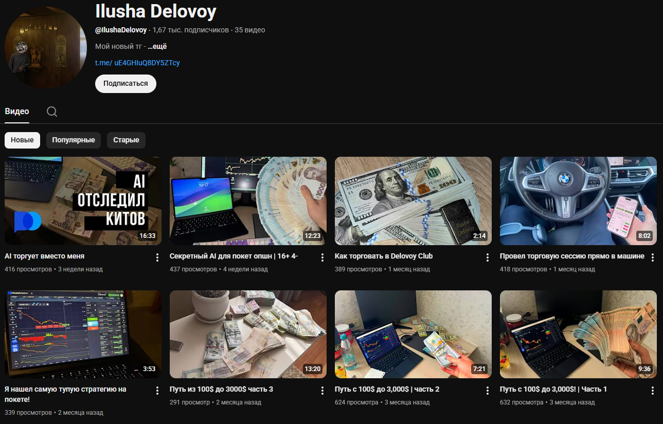 У автора еще есть Ютуб-канал, на котором он рассказывает о том, как зарабатывать на бинарных опционах. Видео не так часто выходят, количество подписчиков небольшое.