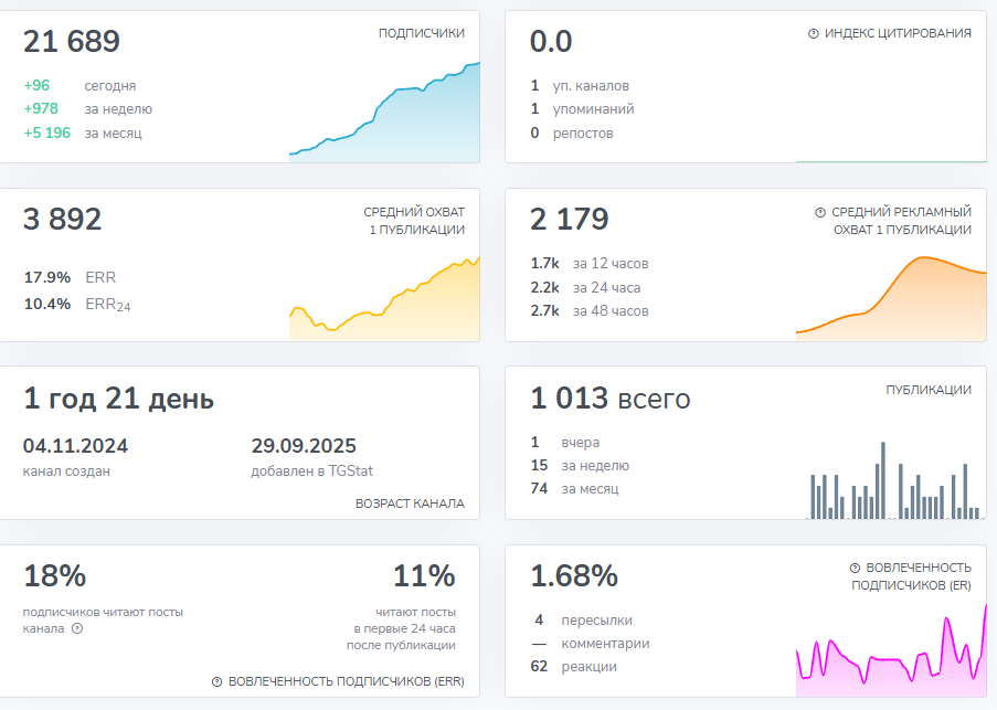 На канал в последнее время подписывается большое количество пользователей, посты просматривает до 18% аудитории из 21+ тысячи человек. Но если посмотреть статистику, то можно увидеть, что автор с высокой долей вероятности просто накручивает аудиторию и активность. Индекс цитирования проекта нулевой. Значит он никак не рекламирует свой проект. При этом рост только за последний месяц составил почти на четверть.