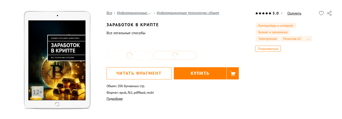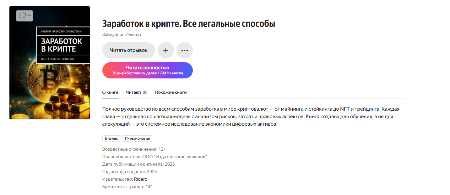 Форматы и цены выглядят так: электронная версия «Заработок в крипте» стоит от ₽150 до ₽600, печать обходится в ₽1,098. Обе книги доступны по подписке, где первые 30 дней бесплатно, далее ₽364 в месяц. Такая модель удобна тем, кто хочет сначала ознакомиться с материалом, который предлагает Ильвир Зайнуллин, однако подписка привязывает к сервису – без оплаты доступ исчезнет. К спорным моментам относят отсутствие рецензий от академических экономистов. Также читатели отмечают, что примеры из международной юрисдикции не всегда адаптированы к российской практике из-за чего инструкции частично теряют актуальность.