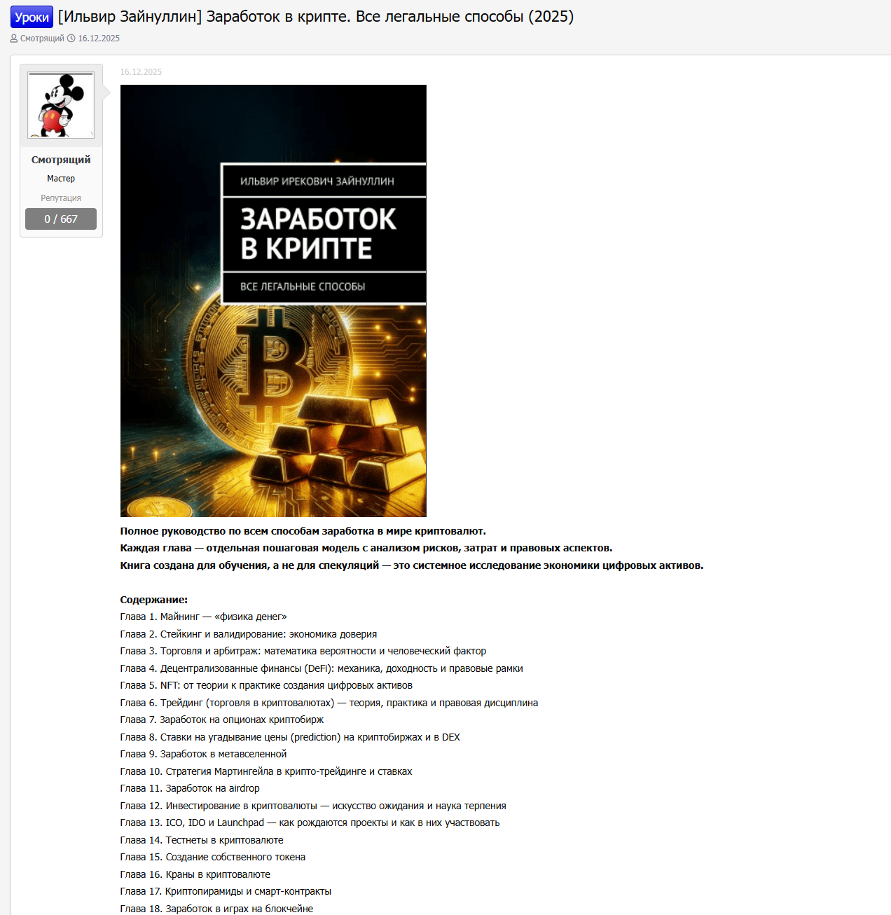 На февраль 2026 года автор предлагает две ключевые книги. Первая – «Экономика. Просто о сложном» состоит из 131 страницы, где объясняются базовые понятия: деньги, рынки, роль государства и влияние технологий. Вторая книга, которую издает Ильвир Зайнуллин – «Заработок в крипте. Все легальные способы» насчитывает 206 страниц и описывает термины майнинга, стейкинга, DeFi, NFT, ICO, метавселенные и airdrop. Каждая глава оформлена как пошаговая модель: минимальный порог входа, список расходов, правовые нюансы в РФ и за рубежом и расчет окупаемости.